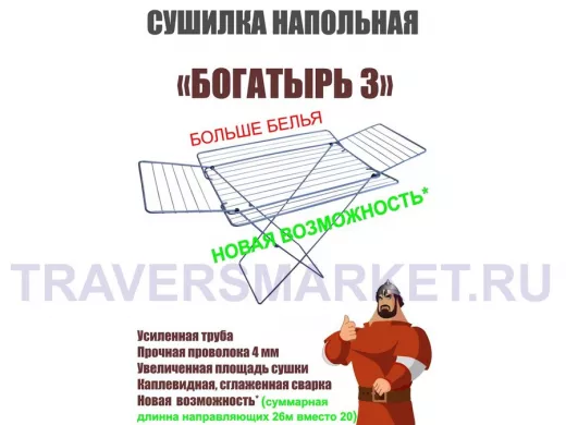 - "БОГАТЫРЬ-3" сушилка напольная СЕРЕБРИСТАЯ 26 метров, предназначена для сушки белья