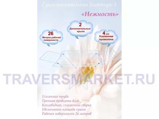 - "БОГАТЫРЬ-3" НЕЖНОСТЬ сушилка напольная БЕЛАЯ 26 метров, предназначена для сушки белья