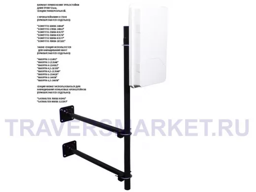 • Данную секцию можно использовать в качестве как нижнего звена мачты , т.к. в нижней части секции есть отвестия для установки подпятника, так и в качестве среднего или верхнего звена за счёт наличия болта для фиксации звена к звену на одном конце секции и обжатия трубы на другом конце. Также применяется с кронштейнами "ХОМУТТО"  для крепления к стене и на торец крыши анттенн, также подходит для коньковых кронштейнов серии "SATMASTER-700", "SATMASTER-900".