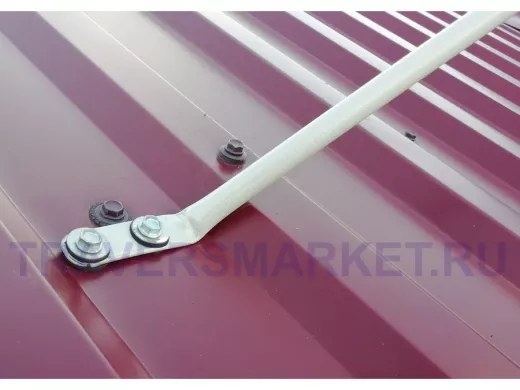 - Для крепления используются два отверстия в подпятнике и по одному отверстию в каждой растяжке. Удобно использовать кровельные саморезы максимального диаметра и длины, чтобы обеспечить надёжность фиксации.