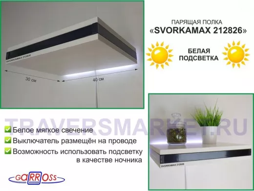 Парящая полка скрытого крепления с подсветкой и тайником, черный "SVORKAMAX 212826" 30х40 см, сосна