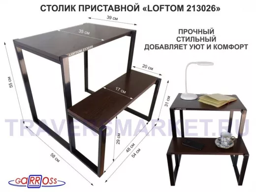 Журнальный приставной столик LOFTOM прекрасно впишется в любое пространство. Столик украсит Вашу гостиную, спальню или коридор. Можно использовать как придиванный кофейный столик, прикроватный столик для завтрака или как стол журнальный приставной. Важно отметить, что прикроватный столик занимает немного пространства, поэтому ему найдётся место даже в самой малогабаритной квартире. Прикроватный/журнальный столик, в стиле Лофт, может быть использован в качестве подставки для цветов и книг, места для работы, места для хранения мелочей. Столик, без труда, можно перенести в любое место.
