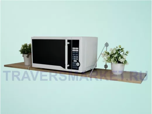 - Полка надежно крепится к стене при помощи анкеров или шурупов с дюбелями, на ней можно разместить микроволновую печь, кухонную технику, посуду, специи