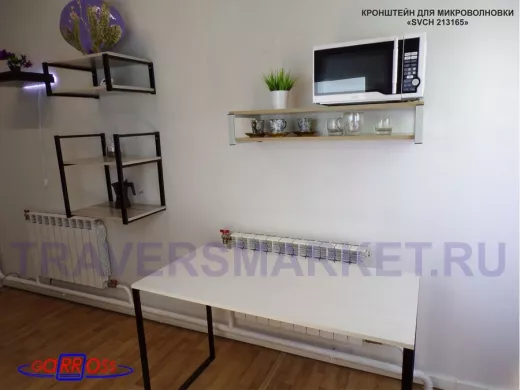 - Полка надежно крепится к стене при помощи анкеров или шурупов с дюбелями, на ней можно разместить микроволнрвую печь, кухонную технику, посуду, специи