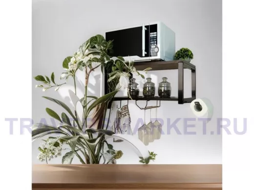 Полка для микроволновки c бокало и полотенцедержат, крючками"ПолкаКрепка-215518"60х30см,черная,венге