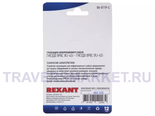 Заказать звонокГрозозащита информационного кабеля, (гнездо 8Р8С (Rj-45) - гнездо 8Р8С (Rj-45)) REXANT (в упак. 1шт