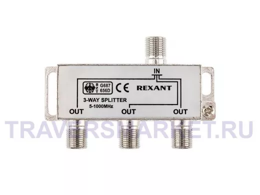 Телевизионный делитель это удобное средство для разделения сигнала на несколько равных частей. Антенные делители, также называемые телевизионные сплиттеры ,часто используются когда требуется подключить один телевизионный кабель, идущий от антенны, сразу к нескольким телевизорам. Особенно это актуально в многокомнатных квартирах или многокомнатных загородных домах. Делитель имеет один вход под F разъем и три выхода, также под F разъемы. Сигнал, подающийся на вход делителя, делится на три равные части и передается на выходы. Для подключения кабелей используются стандартные F-разъемы. Полоса пропускания делителя от 5 до 1000МГц, эти частоты используются для стандартного эфирного телевидения. Качественно изготовленный ТВ сплиттер REXANT долго и надежно прослужит в составе телевизионной системы, делая удобной эксплуатацию нескольких телевизоров.