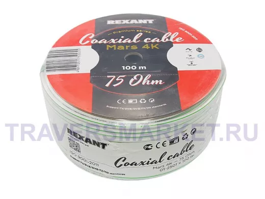 Кабель MARS 4K 75 Ohm REXANT. Состоит из центрального медного провода и металлической оплетки (экрана), разделенных между собой слоем диэлектрика (внутренней изоляции) и имеет общую внешнюю оболочку ПВХ (PVC). Кабель служит для передачи высокочастотных сигналов и имеет волновое сопротивление 75 Ом. Коаксиальные кабели, предназначенные для работы в СВЧ диапазоне, называются еще радиочастотными кабелями.