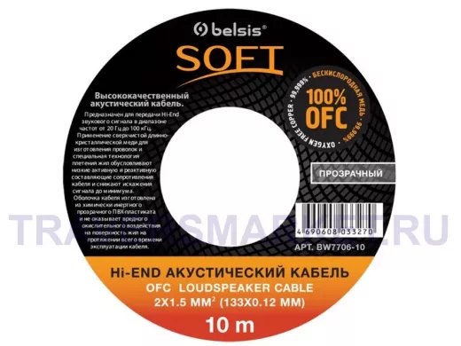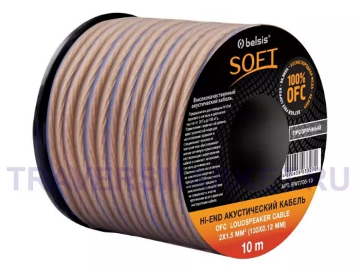 Акустический кабель 2х1,5 мм2 (15 GA) OFC, сверхмягкий прозрачный диэлектрик, на пластиковой катушкке