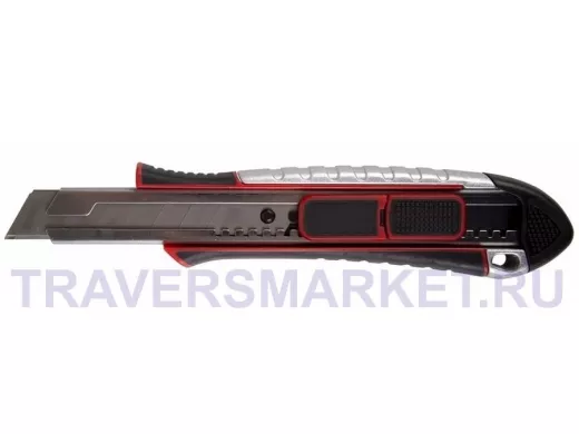Корпус ножа металлический с обрезиненной рукояткой, что позволяет прикладывать значительное усилие при резке, и обеспечивает долгий срок службы. Лезвие изготовлено из стали SK5, фиксируется автоматически. У данной модели добавлена функция мгновенной резки при помощи доп. фиксатора автовозврат.