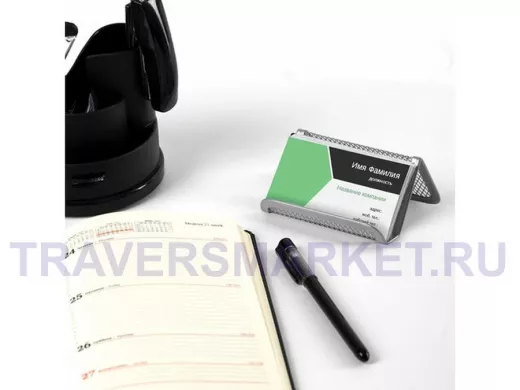 Подставка предназначена для размещения на столе визитных карточек. Современный дизайн отлично вписывается в офисный интерьер.