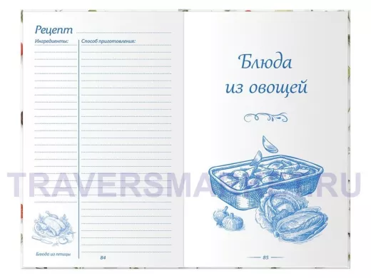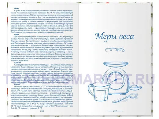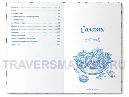 Справочная информация: правила этикета, правила потребления спиртных напитков, мера и масса продуктов. 10 разделов: салаты, супы, блюда из мяса, рыбы, птицы, овощей, десерты, выпечка, напитки, консервирование.