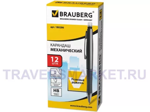 Механический карандаш BRAUBERG с корпусом черного цвета и и удобным резиновым упором, исключающим скольжение пальцев во время письма.