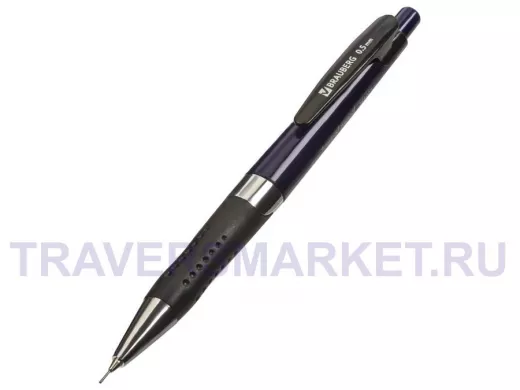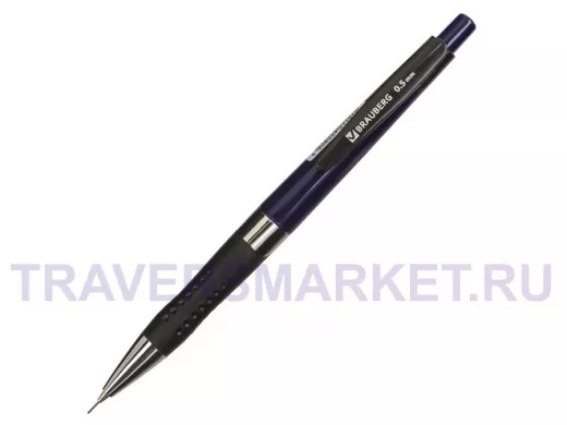 Механический карандаш BRAUBERG с темно-синим корпусом, резиновым грипом и хромированными деталями.