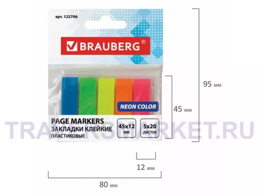 Набор пластиковых закладок 5 неоновых цветов размером 45х12 мм состоит из 100 листов, по 20 закладок каждого цвета. Клейкий слой - 22 Н/м. Легко клеятся к любой поверхности и не оставляют следов. Материал закладок позволяет делать надписи ручкой и карандашом. Уложены на пластиковом основании. Поставляются в полиэтиленовом пакете с европодвесом. Клейкие закладки BRAUBERG помогут правильно организовать рабочее пространство. Выполнять повседневные задачи станет проще, чем когда-либо! Приобрести можно в нашем интернет-магазине.