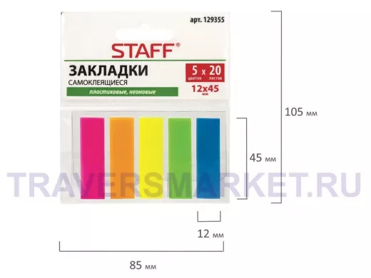 Набор пластиковых закладок 5 неоновых цветов размером 45х12 мм состоит из 100 листов, по 20 закладок каждого цвета. Клейкий слой - 22 Н/м. Легко клеятся к любой поверхности и не оставляют следов. Материал закладок позволяет делать надписи ручкой и карандашом. Уложены на пластиковом основании. Поставляются в полиэтиленовом пакете с европодвесом. Клейкие закладки STAFF помогут правильно организовать рабочее пространство. Выполнять повседневные задачи станет проще, чем когда-либо! Приобрести можно в нашем интернет-магазине.