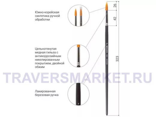 Изготовлена из высококачественной южно-корейской синтетики. Синтетика превосходит щетину в сохранении формы мазка, легкости очистки и износостойкости.