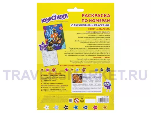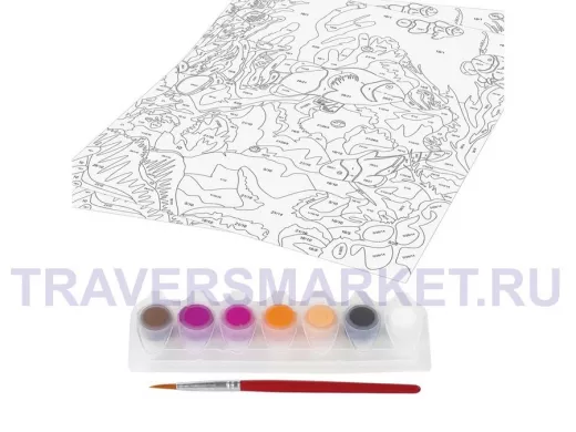- Комплектация: акриловые краски, картон с нанесенным контуром, кисть, лист бумаги для тренировки