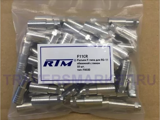F-разъём RG-11 под обжим (с пином) RTM F-803D предназначен для соединения магистрального коаксиального кабеля волновым сопротивлением 75 Ом с распределительными или оконечными устройствами (усилители, головные станции и т.п.). F-коннектор изготовлен из никелированного сплава меди (биметалл). Разъём устанавливается на кабель обжатием, после соответствующей зачистки контактов, с помощью специального обжимного инструмента. Для перехода с жилы кабеля RG-11 на стандартный размер штекера используется специальная вставка (пин). F-штекер выступает в роли своеобразного экрана за счёт накручивания на оплетку кабеля для выполнения роли электрического контакта.