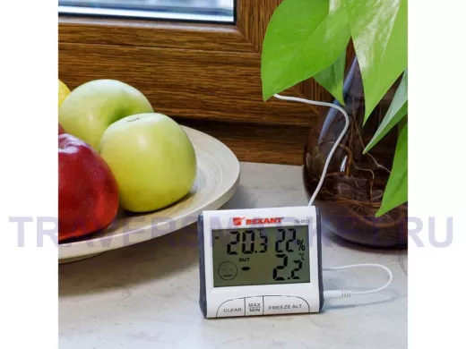 Термогигрометр комнатно-уличный REXANT предназначен для измерения показаний температуры внутри и снаружи помещения, а также внутренней влажности. Регистрирует в памяти максимальное и минимальное значения внешней и внутренней температуры. Отображает общий уровень метеокомфорта. Имеет настольную подставку.