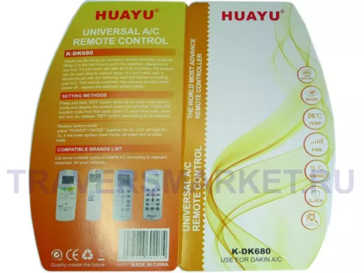- Универсальный пульт Huayu для Daikin K-DK680 изготовлен из качественных материалов и прошел проверку по сертификации CE. Сертификат соответствия СЕ – это международный сертификат соответствия Директивам Объединенной Европы. Поэтому этот пульт никогда вас не подведет!