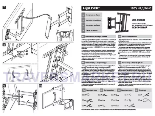 В набор входят все необходимые крепежи, в том числе втулки для телевизора, хомуты для фиксации проводов и инструкция по установке.