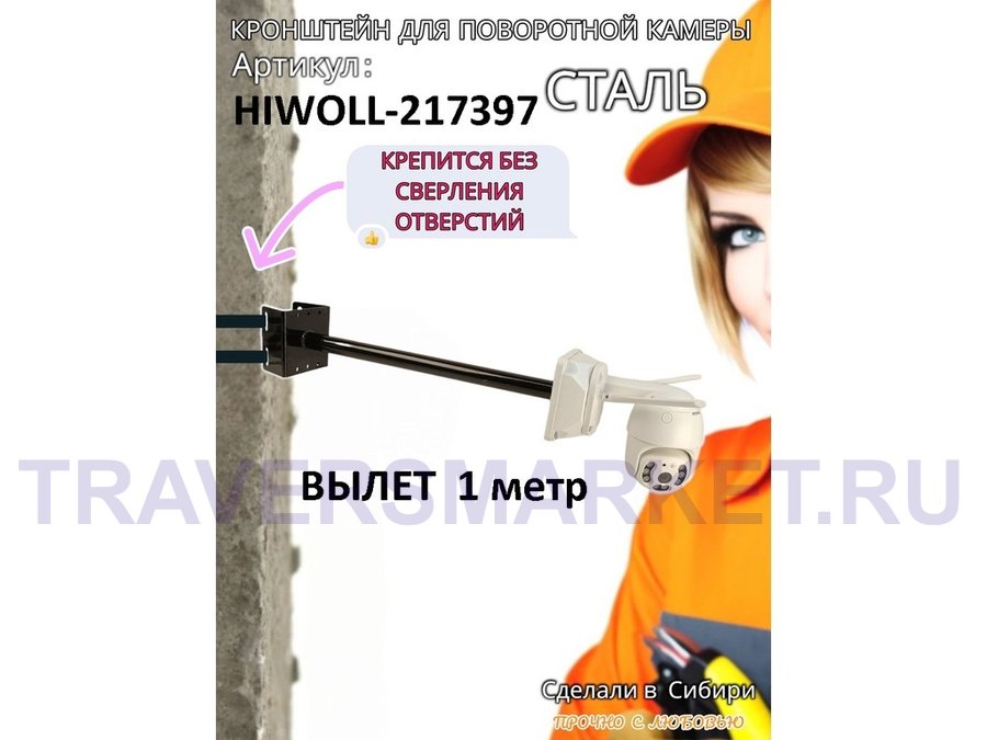 Кронштейн поворотный "HIWOLL-217410" на столб для видеокамеры, вылет 100см, с укосиной,черный, сталь